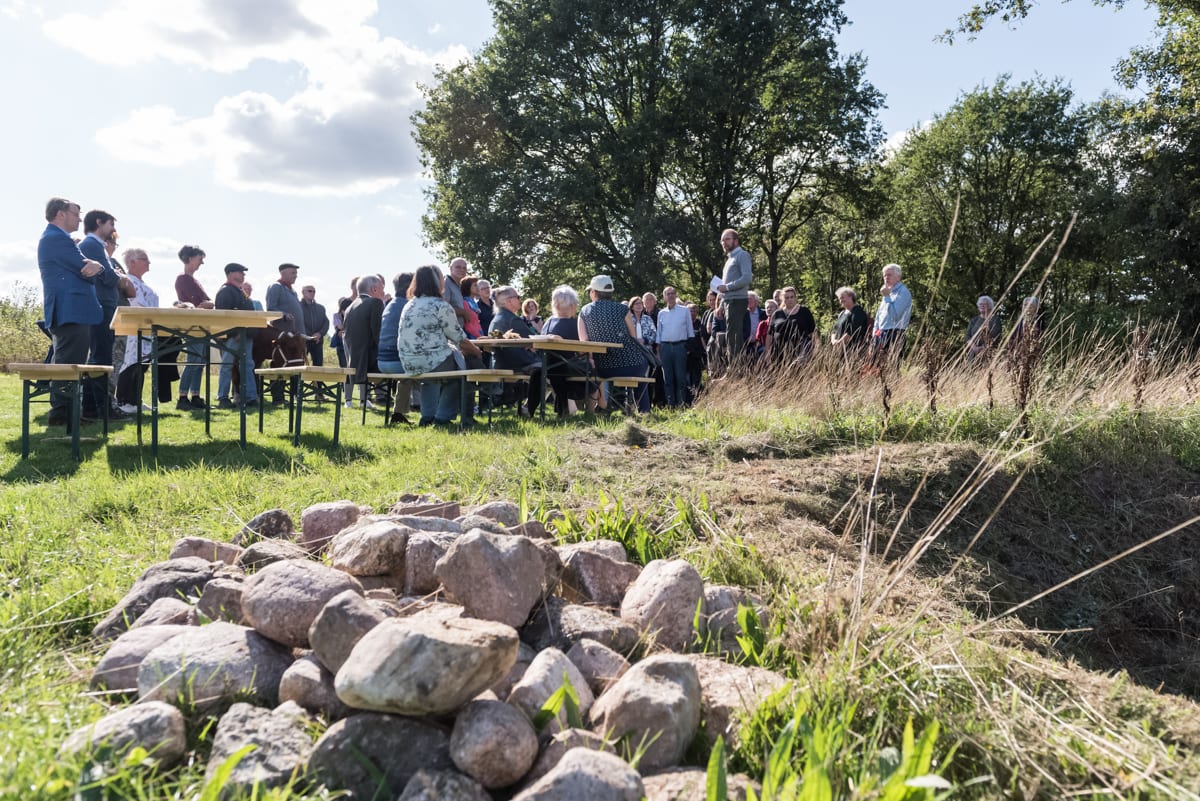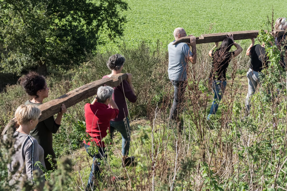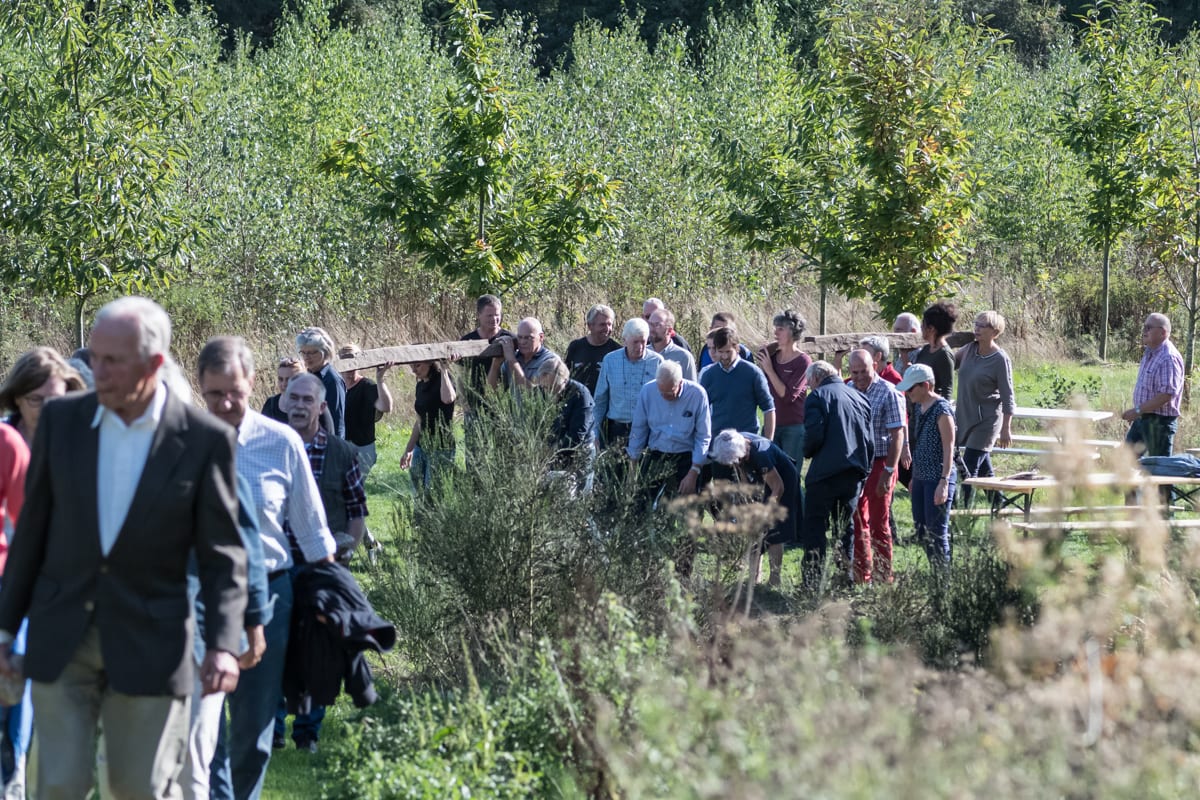 De plaatsing werd een feestelijke gebeurtenis, waarbij personeel, vrijwilligers en gasten gezamenlijk het tempeltje plaatsten op de belvedère. Iedereen droeg letterlijk een steentje bij door een veldkei omhoog te dragen en in de kring te leggen. De eerste keien waren door onze oprichters Dolf en Annetje meegebracht vanuit de gletsjerkuil. Zo verbonden we het laagste punt van het landgoed met het hoogste punt.